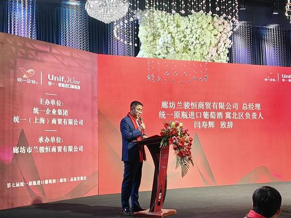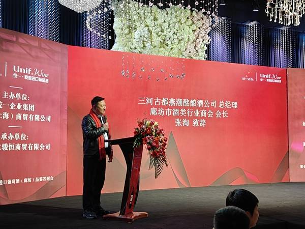 随着《马踏山河,鼓震乾坤》开场舞的震撼上演,晚宴拉开帷幕。在热烈的掌声中,廊坊市兰骏恒商贸有限公司总经理、统一原瓶进口葡萄酒冀北区负责人闫寿辉,三河古都燕潮酩酿酒有限公司总经理、廊坊市酒类行业商会会长张淘,廊坊市黑龙江商会秘书长刘晓梅,统一企业集团葡萄酒事业部全国市场总监范丽琴先后致辞,分享行业发展趋势,表达对未来合作的期许。