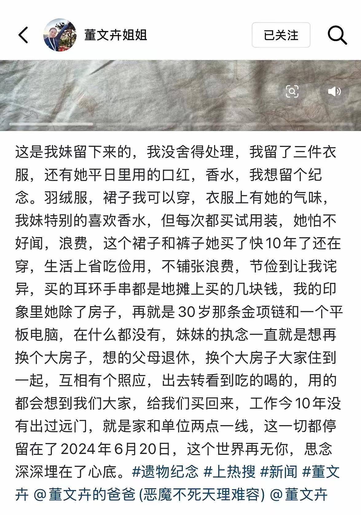 在她被杀后,姐姐整理了她的遗物,虽然她的月薪高达一万多,但是她留下的东西并不多,衣服都是穿了十多年的。就一个笔记本,一根项链,算是值钱的物件。