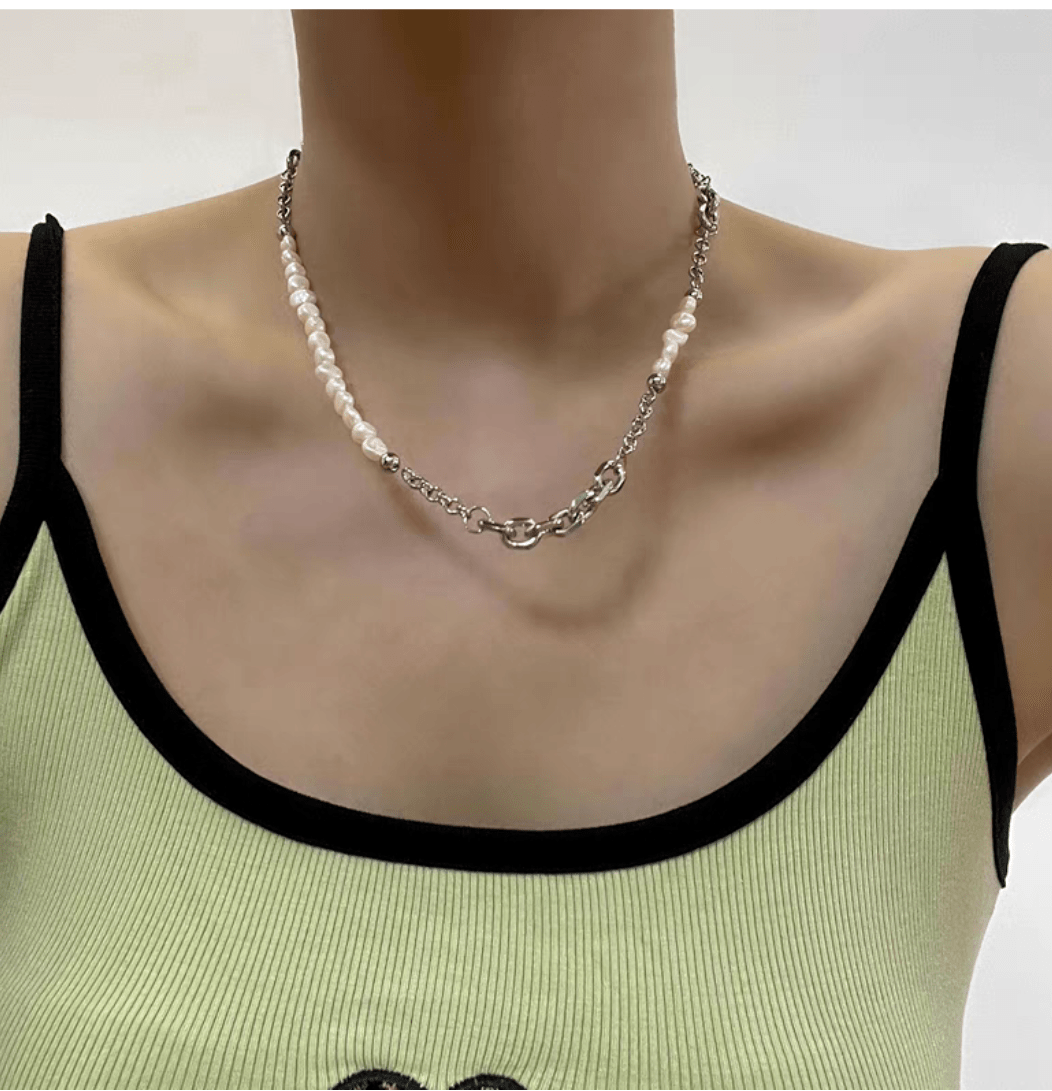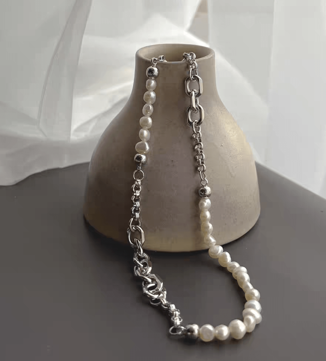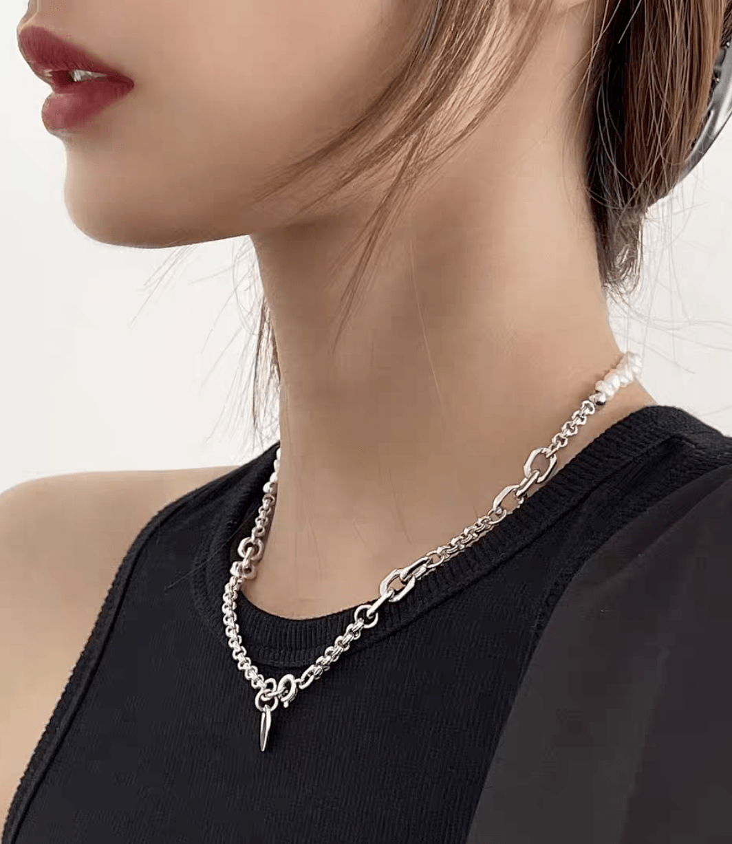 当巴洛克珍珠的宫廷感与银色金属链条的现代感相结合,大胆又摩登,就算只穿基础款衣服也很吸晴~