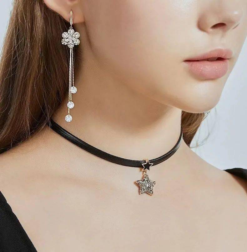 Choker紧贴颈部,自带精致利落感,对于非短脖星人而言能很好地修饰颈部线条,我们在选择上可以结合Choker的粗细和点缀物展示不一样的个性。