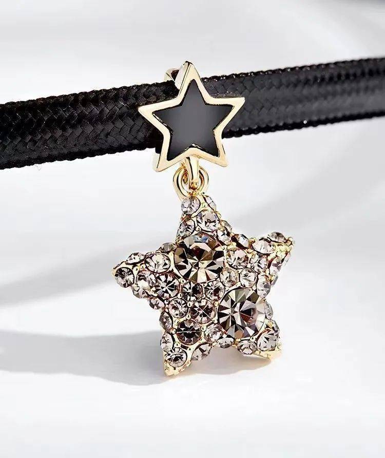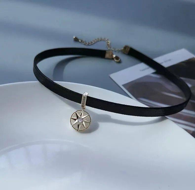 这款Choker的皮绳上是一颗黑色金边星星,下面挂一颗更大的不规则满钻星星坠,在光线照耀下闪射出参差的光芒;