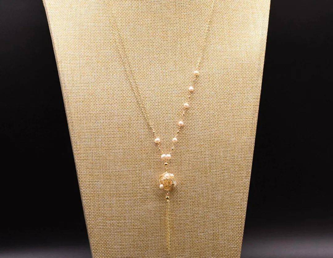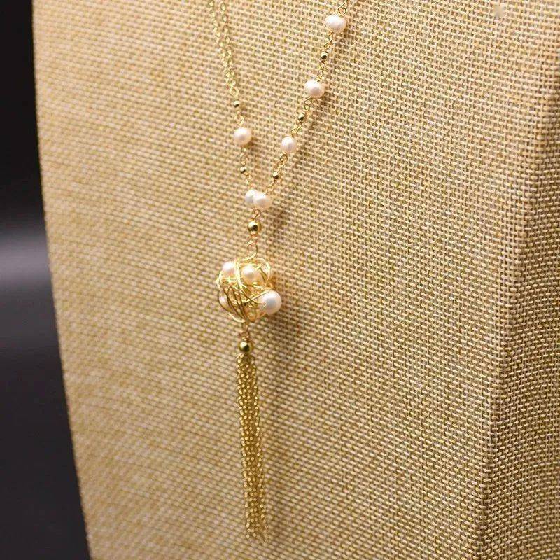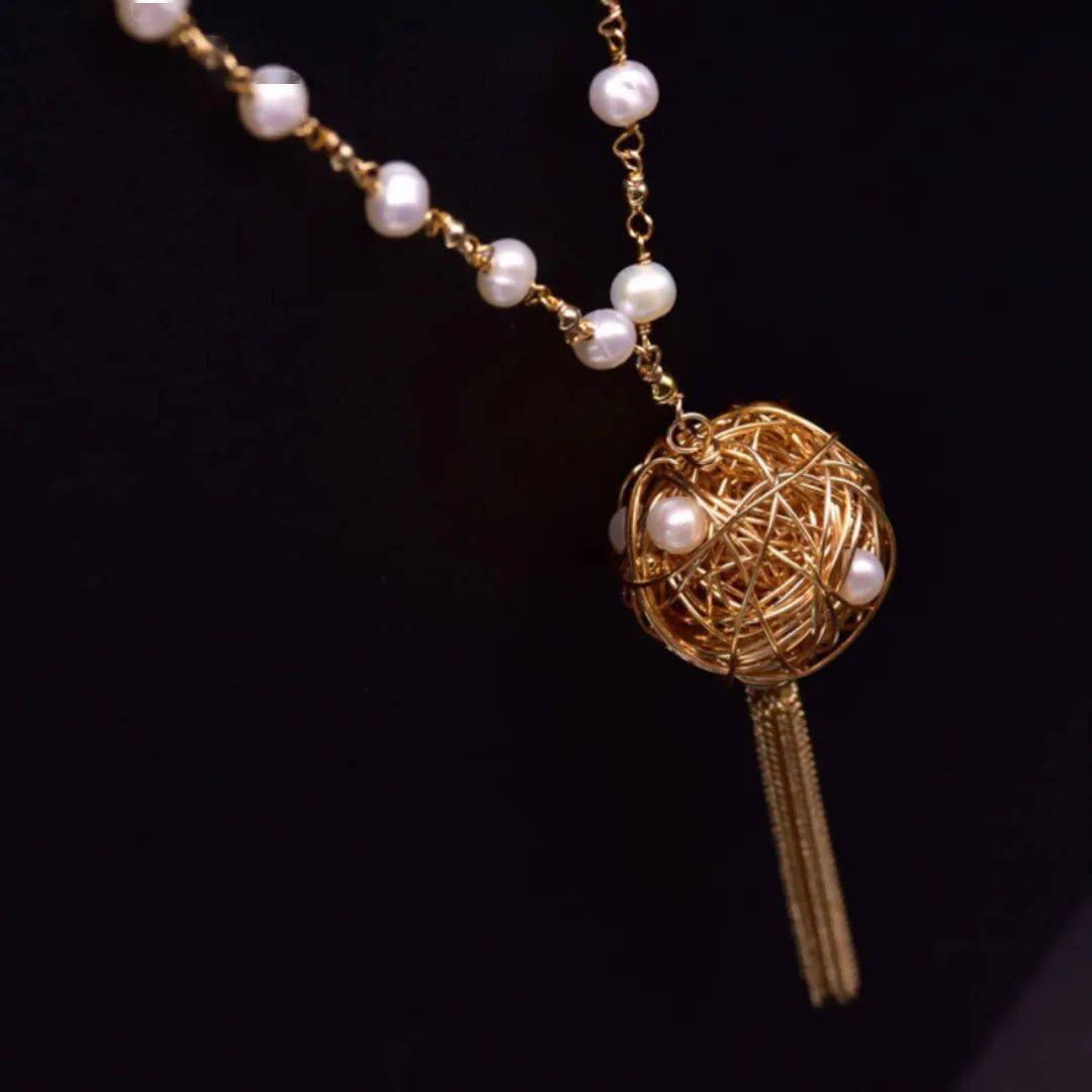 流苏的设计拉长了整条项链的长度,色泽饱和度高的珍珠与金属,对各种肤色都不挑剔。