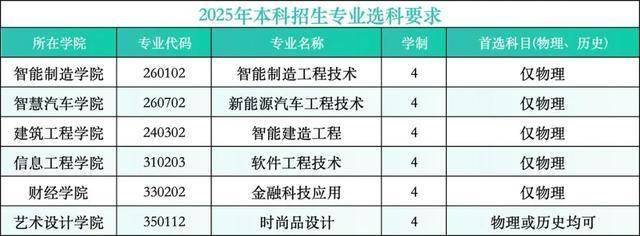 据悉,广州职业技术大学首批设置6个本科专业,分别为智能制造工程技术、新能源汽车工程技术、智能建造工程、软件工程技术、金融科技应用和时尚品设计,共招生470人。6个本科专业均为四年学制。其中,除时尚品设计专业的首选科目为物理或历史均可,其余专业的首选科目均为物理。