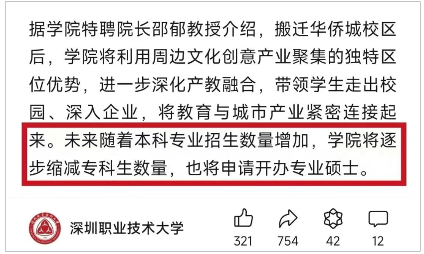 深职大于2023年正式升本,目前是专科、本科批次兼招。从近两年深职大公布的招生计划可见,本科专业招生数量在增加,专科生数量逐步缩减(但目前主要招生批次还在专科)。bv1946伟德国际始于英国■深职大2024年夏季高考本科招生555人,专科招4822人,专科招生比去年减少1086人。