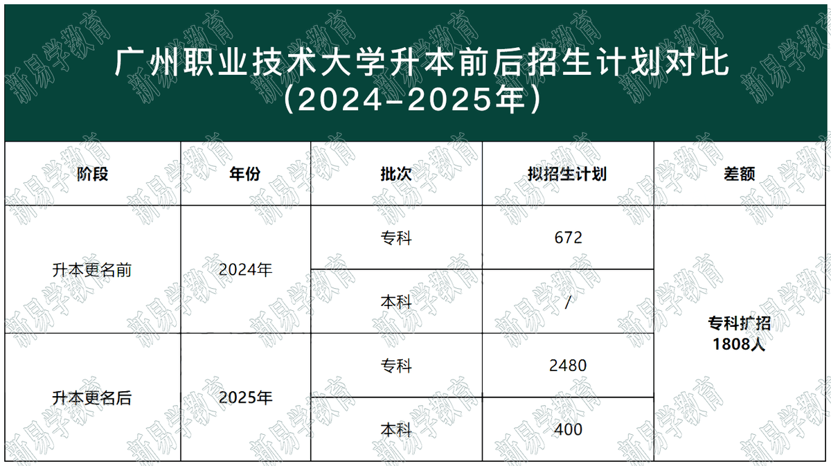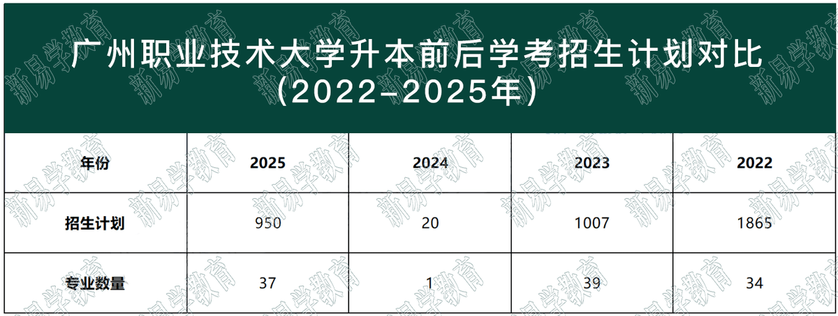 以广州职业技术大学春考为例,该校在2025年完成升本改大,在2024年春考招生计划仅为20人,2022年为50人。但在是确定升本改大后的当年,招生计划出现大大幅度回升,相比24年扩招了930人!