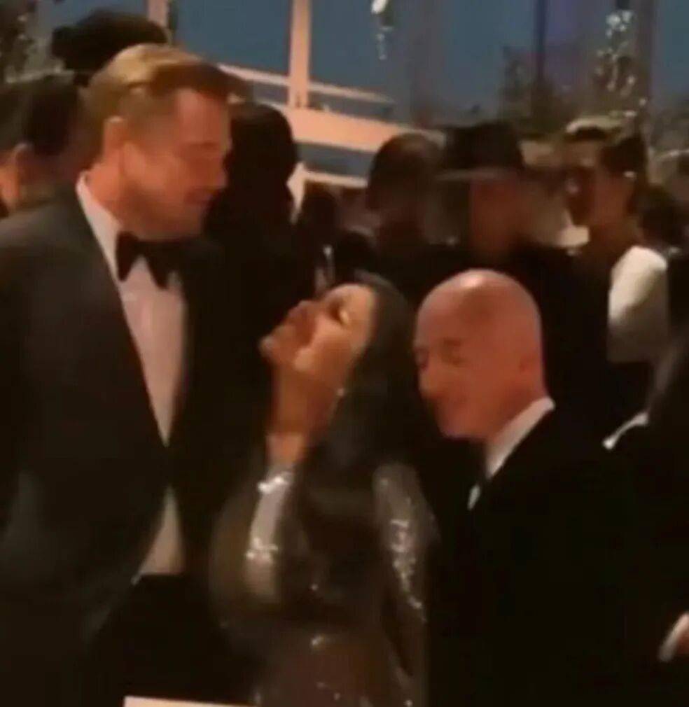 贝索斯两人和小李子相遇寒暄,桑切斯仰头直勾勾盯着小李子的脸,眼神都快拉丝了;贝索斯则在旁边一副备受冷落的苦主样,笑死个人。