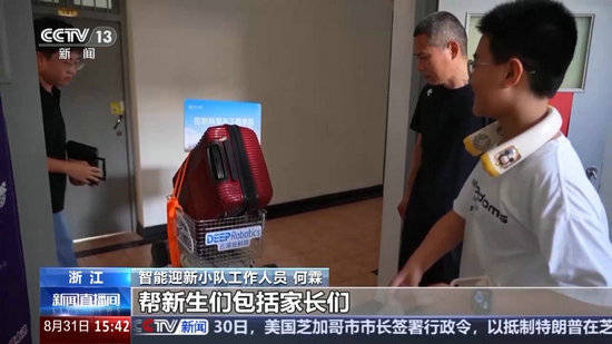 智能迎新小队工作人员 何霖:它们一个是腿足式的,一个是轮足式的。轮足式的移动速度要更快,腿足式的承载能力更高,能够负载40公斤,帮新生们、家长们减轻运送行李的压力。