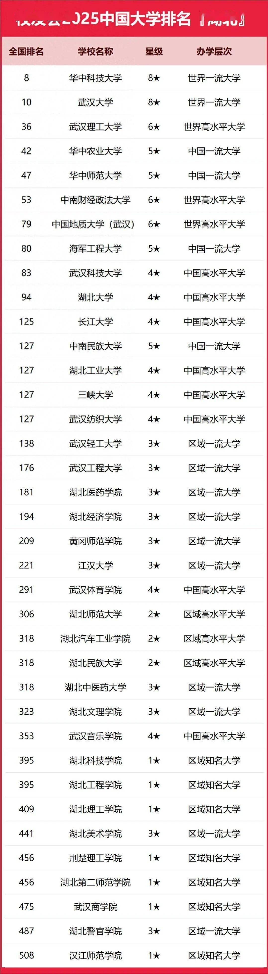 校友会最新发布的2025中国大学排名中,湖北高校的最新排名变化不可忽视,该榜单展示了各高校的整体实力,也为考生、家长提供最新参考,华中科技大学位列全国第八,是湖北省排名最高的高校‚排在其后的是武汉大学‚排在第10位‚武汉理工大学排名全国第36,工科水平较好,湖北大学排在全国第94,是省属重点大学‚显示了稳定的态势,武汉工程大学位于全国第176,也值得关注‚特别是黄冈师范学院以第209名的成绩领先于江汉大学的第221位‚这些新的情况显示出湖北高等教育格局的新态势。