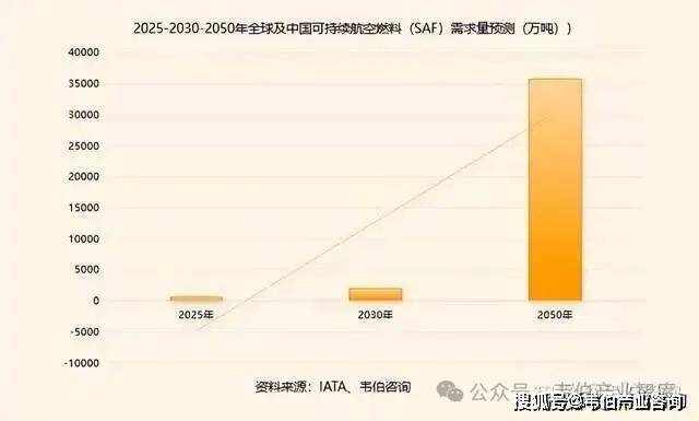 国际航空运输协会预测:2025年和2030年全球可持续航空燃料(SAF)需求量将分别达到600万吨和2000万吨;到2050年,SAF将承担航空业65%以上的减排贡献,需求量高达35,800万吨。