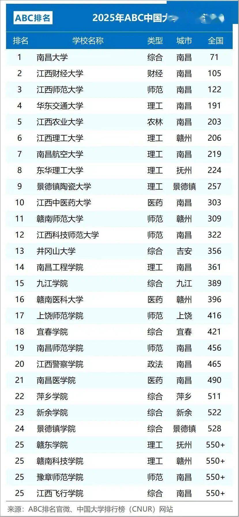 江西财经大学第二,排在全国总榜第105名;江西师范大学第三,排在全国总榜第122名;华东交通大学第四,排在全国总榜第191名。