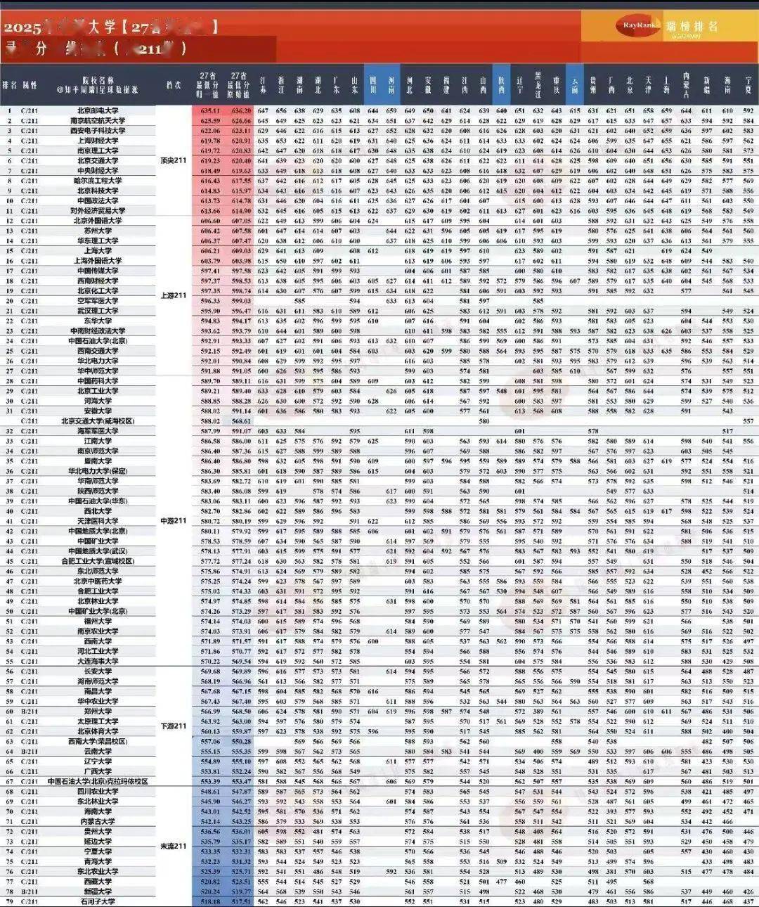 接着是第二等级——上游211大学,2025年高考,27省物理类最低分归一值介于591分~607分之间。